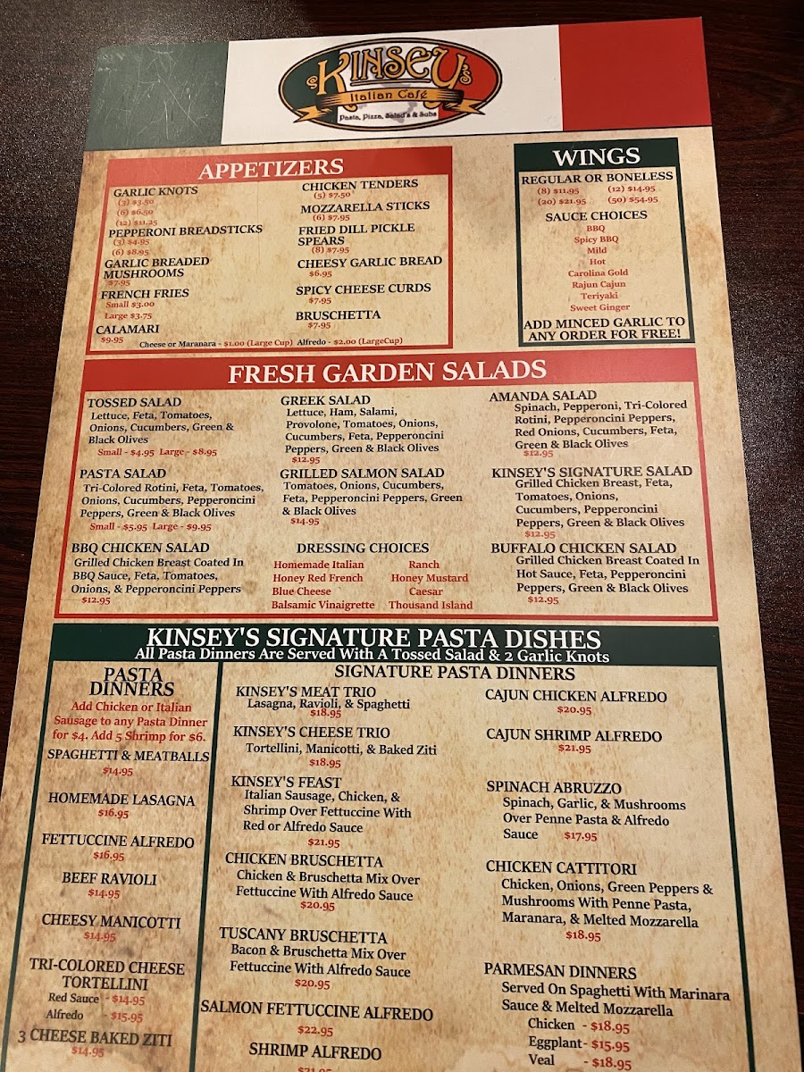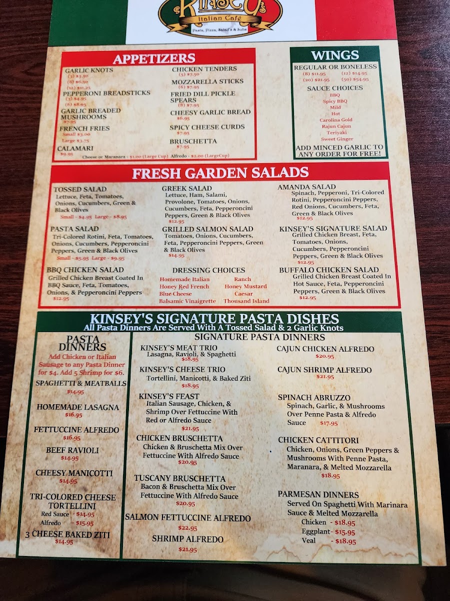 Stop by for a glass of Chianti — it's the perfect accompaniment to any dish. Kinsey's Italian Cafe is more than just a meal; it's an invitation to indulge in Italy's rich culinary heritage.